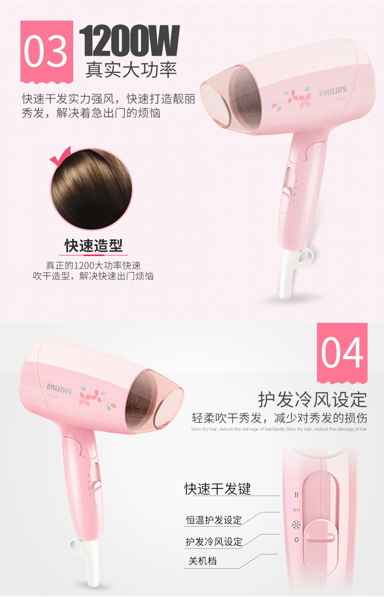 此款 1200 瓦的电吹风可产生适宜的风量,吹干同时呵护头发,让您每天拥有靓丽秀发效果。